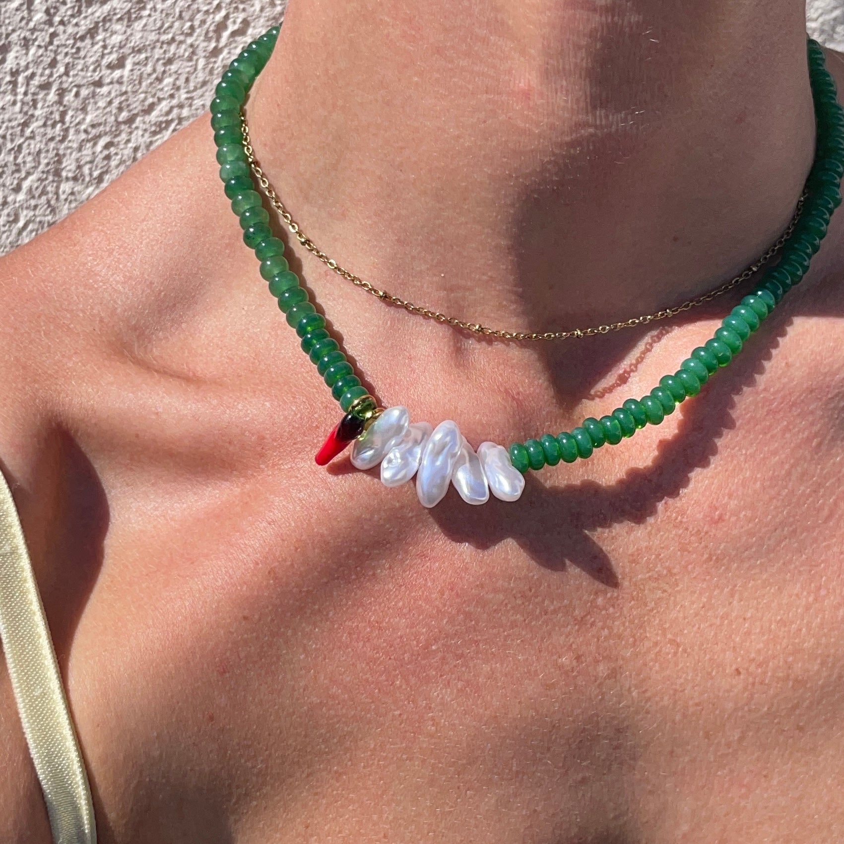 L’intensité du vert, la douceur nacrée de la perle de culture et le piment rouge audacieux : un collier solaire qui respire la joie et le tempérament.